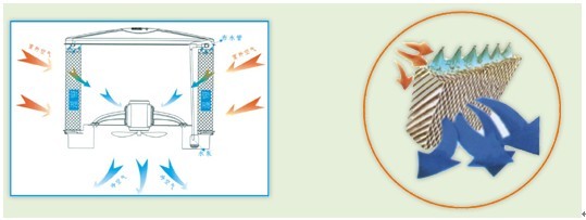 蒸发吸热原理降温,当热空气,或有异味的气体及有粉尘的空气经过湿帘,过滤网及水的净化从而使机组里